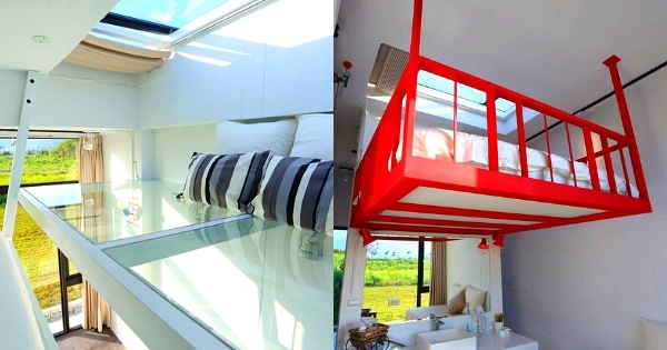 Z字型的床舖設計,簡約白及透明玻璃的閣樓,非常時尚!廁所以大片拉門做隔間,粗獷味十足,衝突的美感達到一種微妙的平衡。