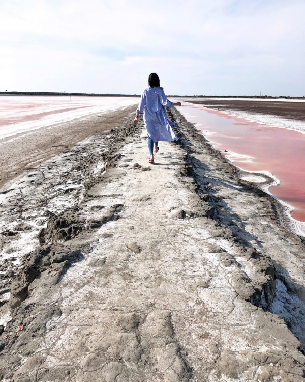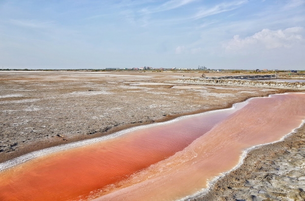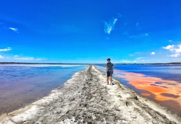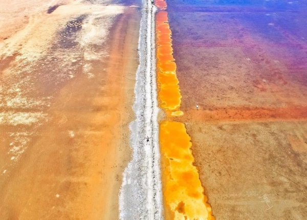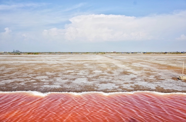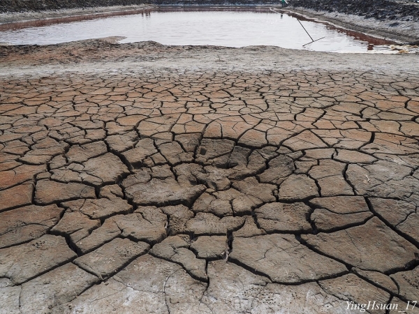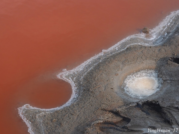 整片海水呈現紅褐色,甚至有的結晶成白鹽,在陽光的照射下還會看到白藍海鹽,而鹽田較高區會先被曬乾,因此變成了龜裂的鹽灘地了!