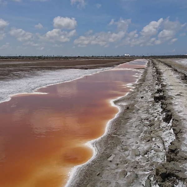 想看彩色鹽灘景觀不用跑去國外,來七股就能目睹這種奇景啦!在頂山的廢棄鹽灘地因海水引入鹽田,久旱不下雨,蓄積的海水長期受陽光照射蒸發所形成,成了高濃度鹵元素水,有的還積聚成鹽!