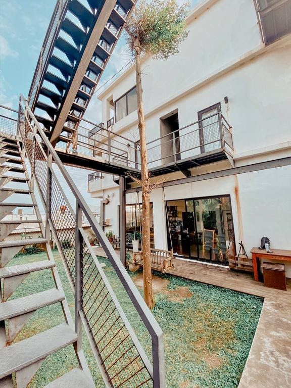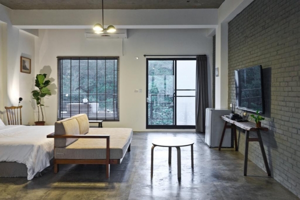 民宿整體走許多人超愛的極簡工業風,以黑色鑄鐵為材質,充滿了濃厚的工業感。並且刻意保留部分的空間規劃為庭院,藉由綠色的植栽和草皮緩和了工業風陽剛冷硬的感受。