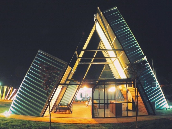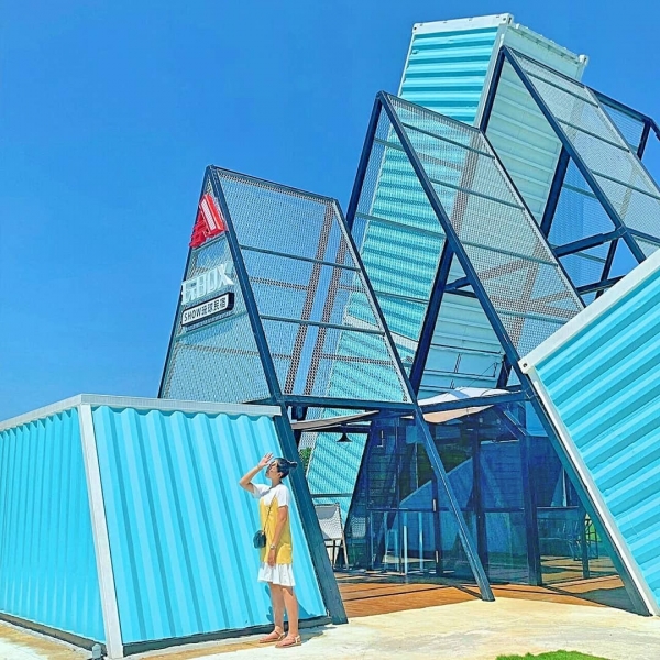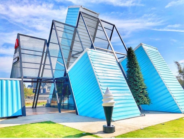 園區裡除了貨櫃房間之外,也規劃了這座水藍山丘造型的建築物,在大小不一網狀格子的三角形裡還隱藏著一間玻璃屋,是販賣冰品及享用早餐的地方唷!