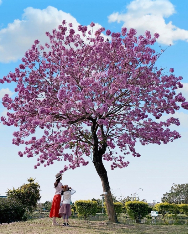 這裡是一處人工溼地,裡頭設置了木棧道、生態島,而最近園區裡的唯一一棵洋紅風鈴木正在盛開中,在藍天白雲的襯托下更顯浪漫。