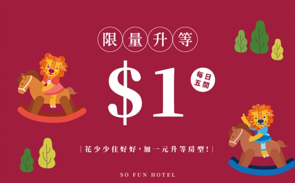 ◎平日入住訂單,只要加 1 元即可升等房型,每日限量 5 間(數量有限先搶先贏!)