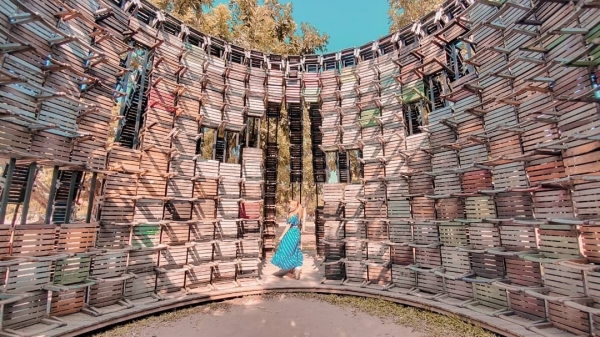 在高雄駁二特區微熱山丘旁的公園裡,隱藏著這座超大型裝置藝術!外觀像飛碟的椅子樂譜非常有趣,是利用學校回收的舊椅子搭建而成,走進去一看,裡頭每張椅子背後都寫著不同學校的名字,瞬間勾起了大家的童年回憶啊!