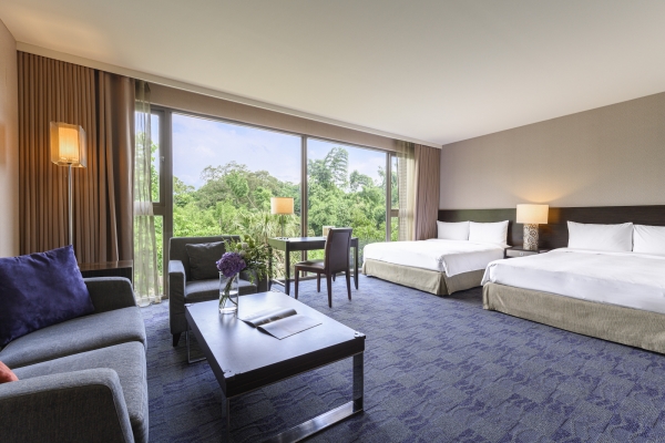 現代簡約風格,暖色調設計注入溫馨氛圍,全景式落地窗之視野將大片綠意融入空間,房內設置可供多人休憩的小客廳,為全家出遊或三五好友同行的入住首選。