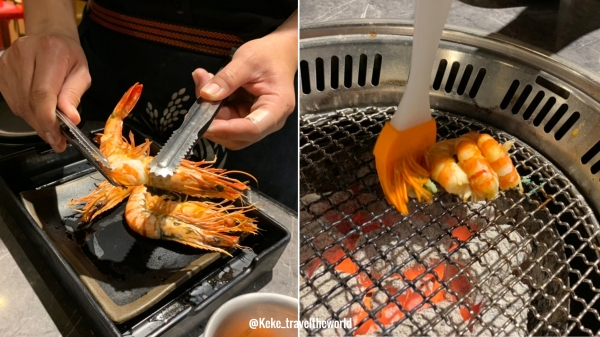 有點蝦子的話店員都會幫忙烤,田季發爺使用的是黑虎蝦