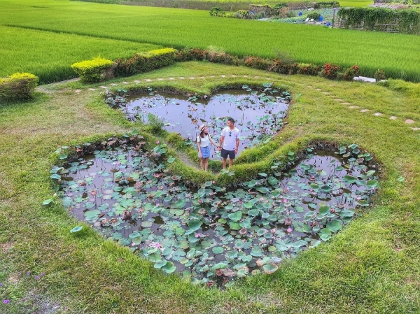 位於大村內樸實的平和社區裡,有個一夕爆紅的雙心池塘,仿照澎湖七美島上的雙心石滬,透過社區營造挖出了雙心型的水池,並種上美麗的重瓣粉蓮,即成了綠野版的雙心池塘!