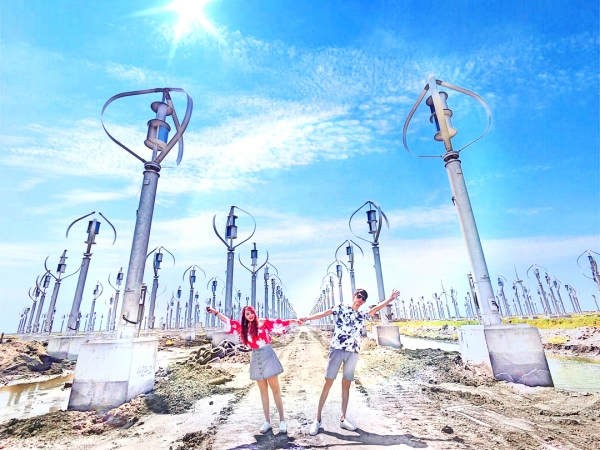 彰化外海因為風力資源豐富,被發電業者看中並利用2萬6千多坪閒置的魚塭設計為彰化第一座大型垂直軸風力發電區,遠遠望去就像是一片機器森林,也有幾分神似美國打卡景點Urban Light,都是一根根豎立的建築景色,還沒去過美國踩點就先來彰化打卡吧!