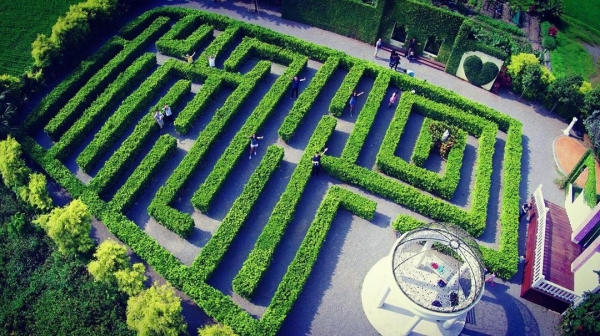 以南法悠閒莊園為主題打造的餐廳,園區裡有許多異國夢幻場景,並結合了餐廳、迷宮花園及沙坑等等設施。其中最吸睛的就是這個大型綠色迷宮,一旁也貼心設計出較高點的平台,可以站在上面遠眺整個園區造景,感覺自己就像這座花園的主人啊!
