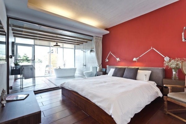 有一張Queen size的豪華雙人床,這種房型配置的是開放式衛浴,還有景觀陽台,很適合情侶或是新婚夫妻來住喔!