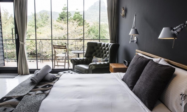 一張大雙人床,旁邊就是落地景窗,躺在床上就能眺望山水風景,多麼愜意阿!!!