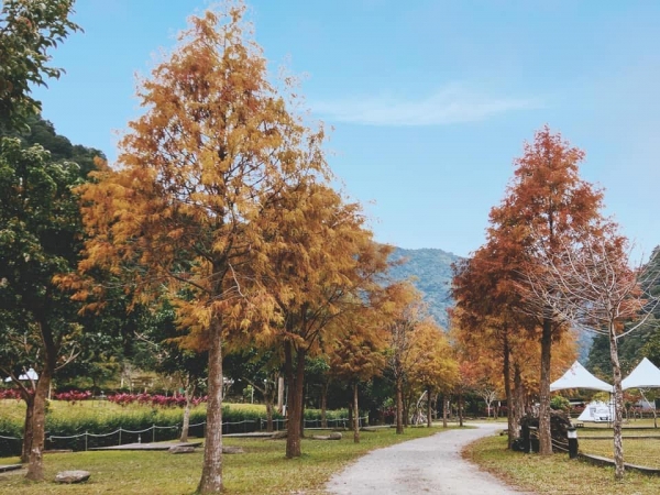 業者在一旁種植了許多落羽松,秋冬時節由黃轉紅時,整個營區被落羽松包圍著,可以想見一定非常浪漫~~