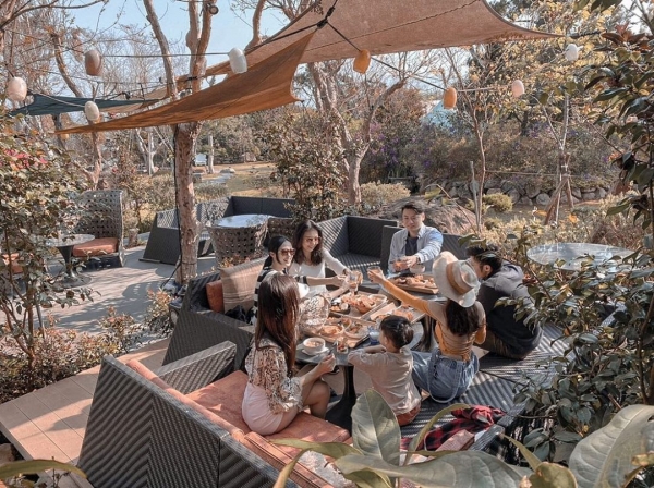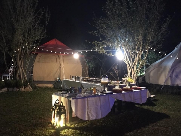 區內植滿綠色草皮,放鬆舒壓或跑或跳縱情自然。入夜後升起熊熊營火,大地餐桌上演美食饗宴,主廚精心烹調餐點、自然為景、蟲嗚為樂,上方也掛滿彩色風箏,讓你在炎熱的陽光下得到一點喘息~