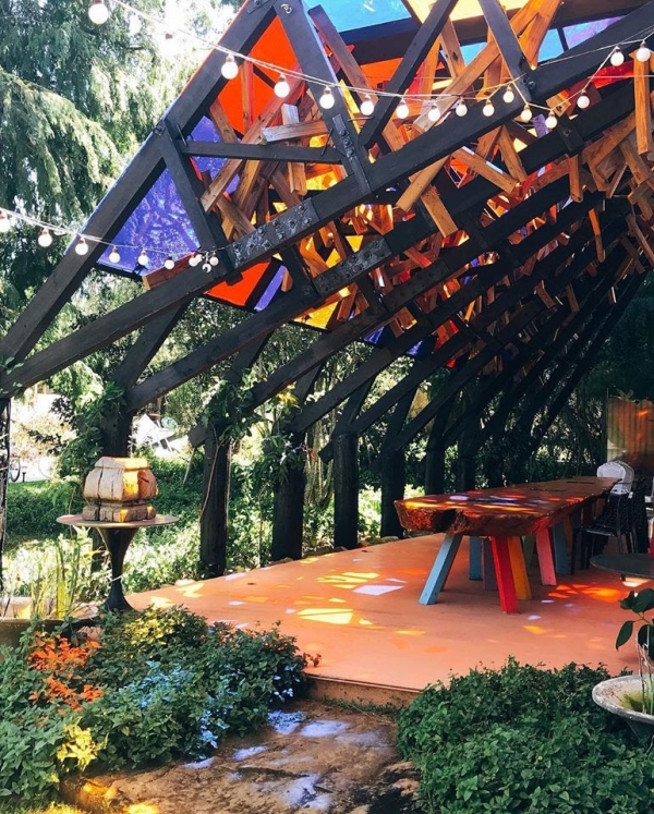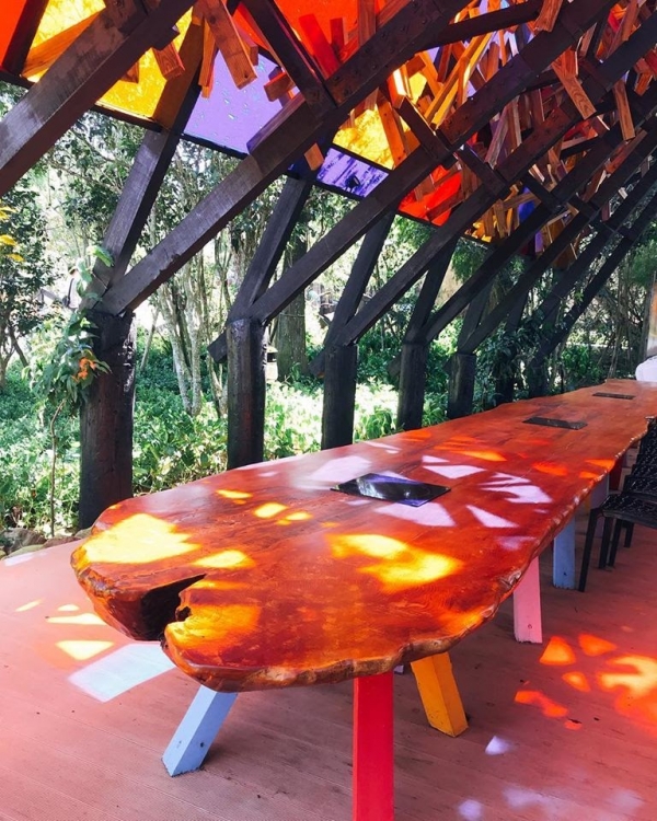 利用木桁架及廢棄電線桿漆上顏色,打造出斜頂式半開放空間,