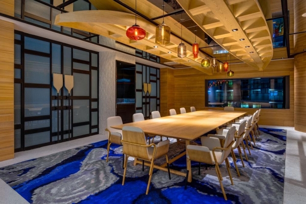 因為大直一帶在日治時期有台灣知名磚窯廠、河岸文化等元素,酒店內的客房、浴室等,也都加入特別龍舟、磚瓦印象來設計,每個房間都有不同的壁畫,可以發現都是由龍鱗、水紋等元素構成,甚至到地毯都有它特別的樣子!