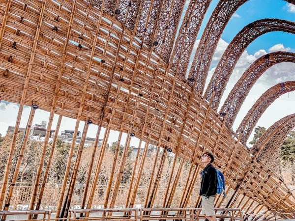 位於豐原的「葫蘆墩公園」裡面的竹跡館是一處打卡秘境,以竹林及中央山脈為發想概念,利用台灣本土竹子大大小小橫豎交錯編織,打造出10米高的竹拱圈!