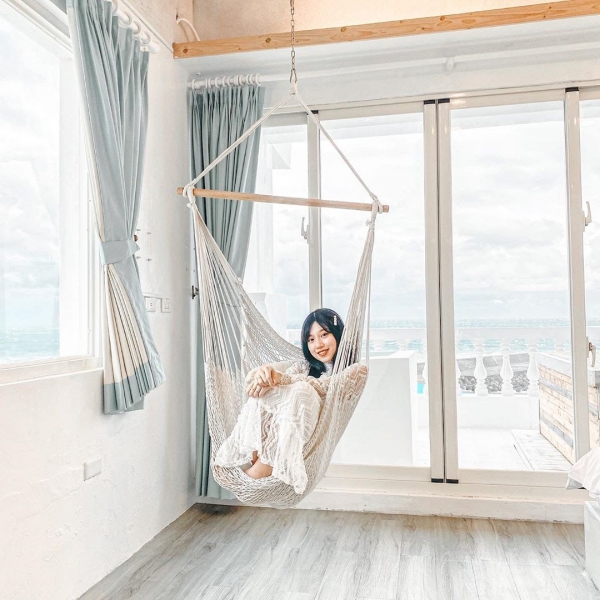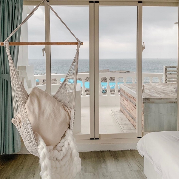 全白的色調,搭配墾丁海景,彷彿到了海島度假,房間內還有編織吊椅,落地窗外的陽台可以直望波瀾海景,還真是一大享受啊!!