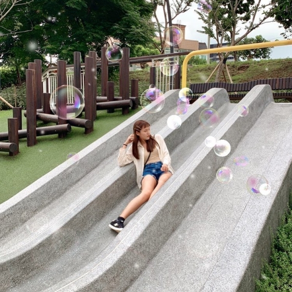 除了最矚目的滑輪溜滑梯外,一旁還有很多不同的遊樂設施,磨石子滑梯,較小型一點,怕高或是不敢溜大滑梯的小小朋友們也可以來這裡溜~