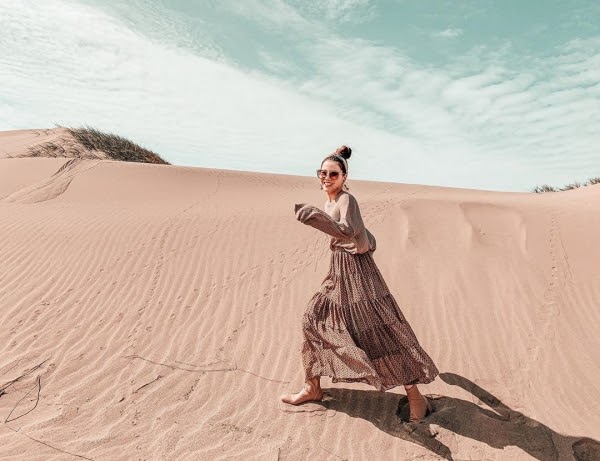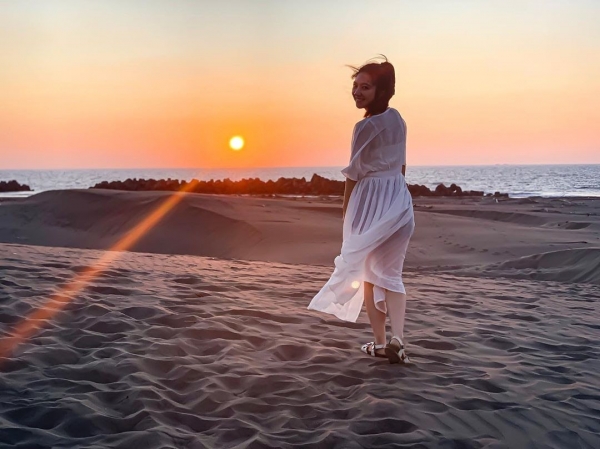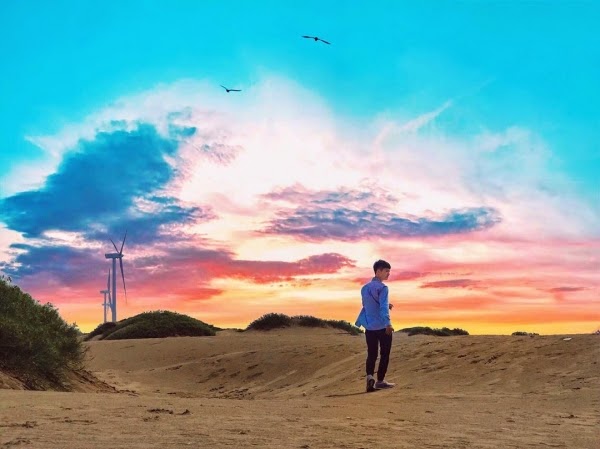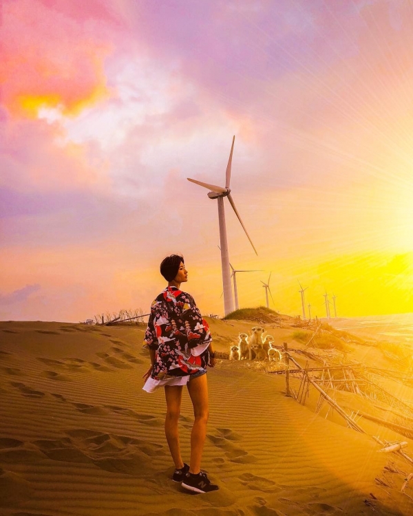 每當夕陽西下時,成排的發電風車佇立、沙岸與海連成一線、起伏的沙丘上,蜿蜒沙紋交錯著腳印,有一種寂靜又蒼涼的美感!