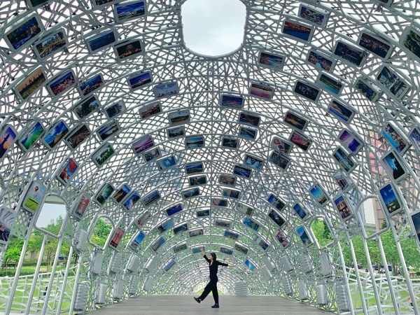 位於中壢的青塘園有著「桃園秋紅谷」的稱號,在縷空的內部空間裡有無數張景點的照片,是許多人一起來到這裡、規畫著以後一起牽手走遍世界的夢想,是不是很甜蜜!
