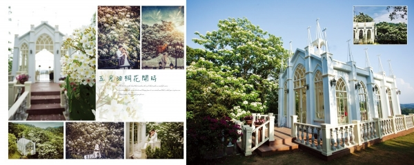 想當然啦,白色教堂是許多新人拍婚紗的取景地,浪漫的純白教堂搭配超夢幻的婚紗,還能直通戶外觀景台,尤其是四周的油桐花開時就像仙境般那樣唯美!