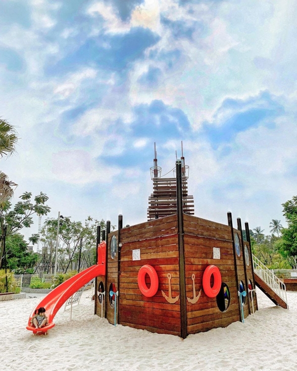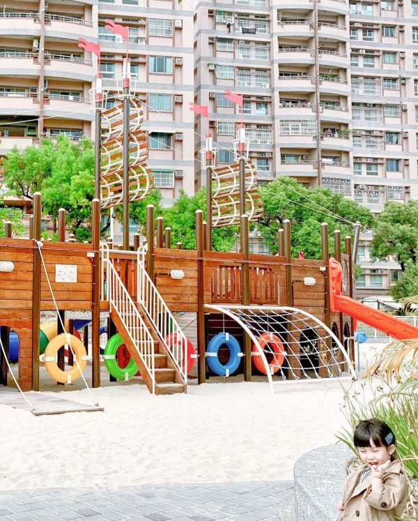 公園裡竟然有超大海盜船!!!這裡完全就是孩子們的天堂,超巨大的沙坑哩,有著海盜船的遊樂設施,鳥巢鞦韆、旋轉滑梯、蜘蛛攀網等等~在家帶小孩太累了就帶來這裡吧!!