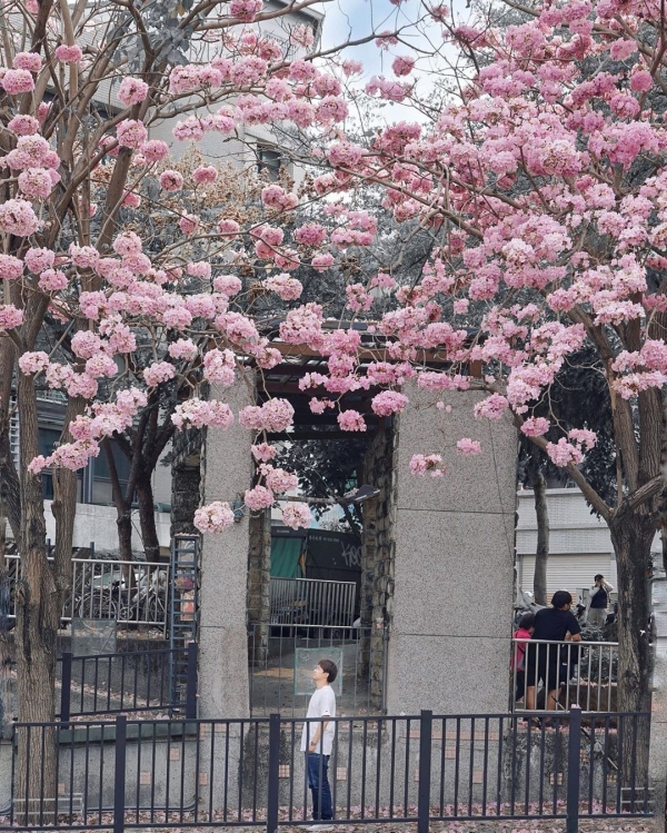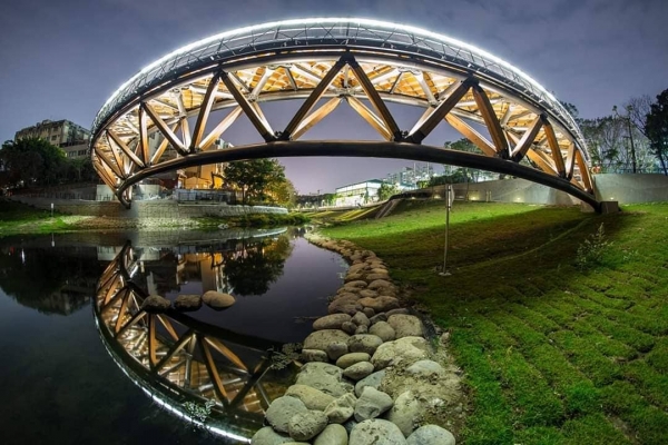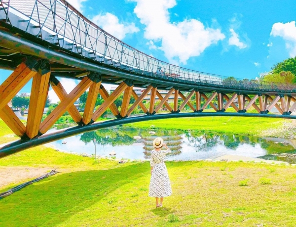 除了遊樂設施之外,還有半月弧形設計的「月見橋」倒映在湖面,不管日夜倒影都好美,加上步道旁還開滿了粉紅風鈴木及許多豐富的自然生態,因此有了「台版清溪川」之稱!