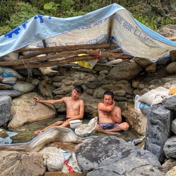 如果怕有落石可以自己拿大塊拼布遮在上面,也可以預防一些不知名蟲類掉入溫泉,很適合一家人一起來泡湯,比起溫泉旅館,這裡更能讓人留下深刻的印象~