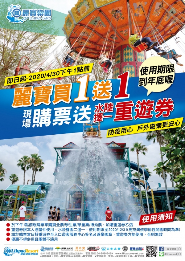 麗寶買一送一,現場購票贈水陸擇一重遊券