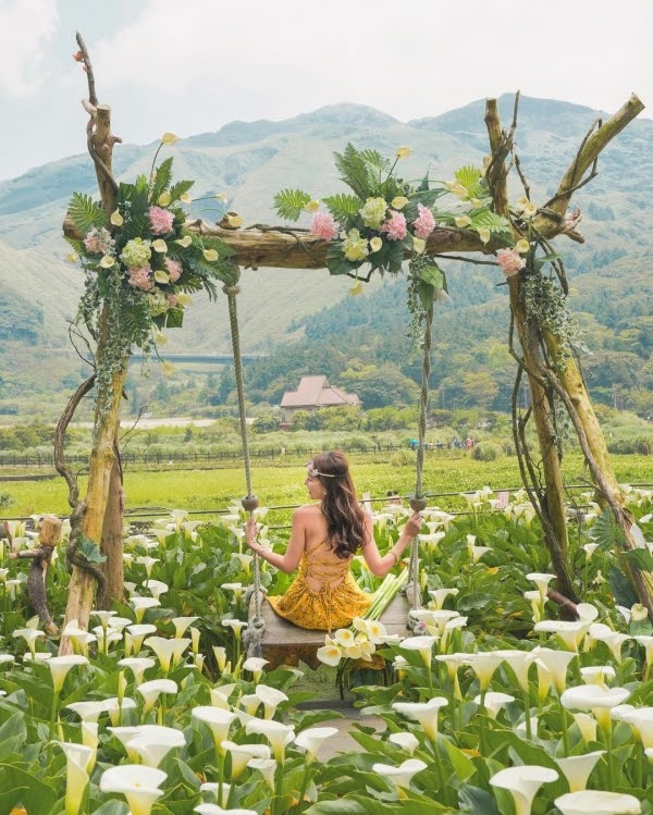 身為台北後花園的陽明山,有著琳瑯滿目的花種,海芋及繡球花滿滿盛開,田中還有增設浪漫鞦韆,拍起照來有夠仙,彷彿來到一座夢幻小仙境,那絕美的畫面十分動人!