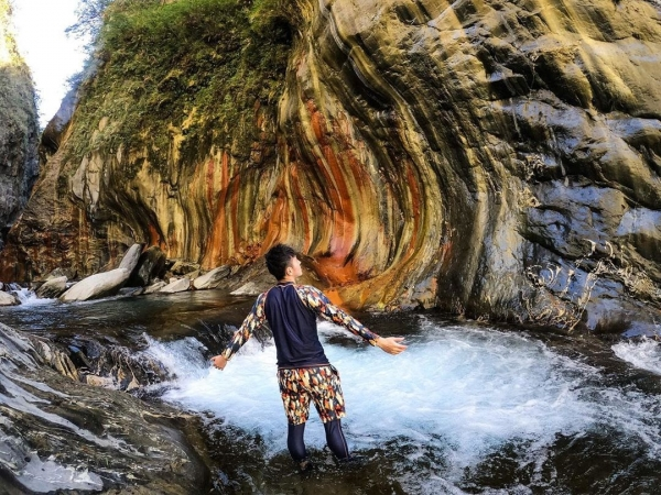 堪稱全台第一野溪秘境的哈尤溪溫泉以七彩岩壁聞名,又稱為雲豹之湯,因岩層富含各種礦物,加上岩壁硫磺的沖刷,呈現紅、黑、黃、白等多種色澤,完美的與壯麗峽谷結合,形成一幅天然山水畫!