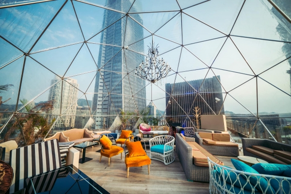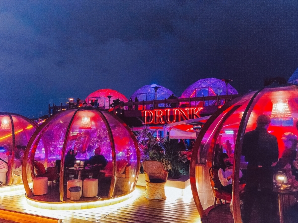 【Drunk Play 爛醉不累】以開放式的空間打造空中派對花園的氛圍,有360度無死角的巨型泡泡屋、水煙玻璃屋包廂、露天階梯式包廂、挑高玻璃屋包廂,每一個包廂都極具特色,而所在地就在信義區,更能超近距離的眺望台北101,白天有種美式派對風,到了夜晚,點燈後換上另一種神祕氛圍,在這裡可以賞夕陽、看夜景、喝咖啡、吃泰國料理。