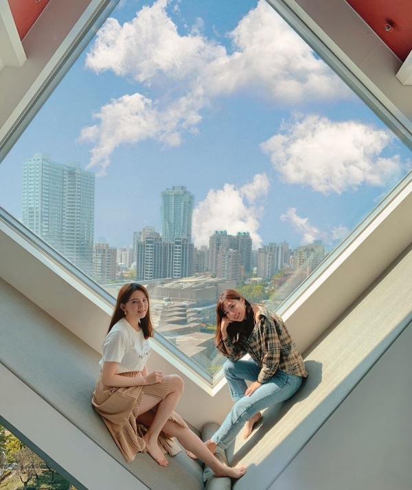 沒事就可以坐在菱形窗緣一覽台中的都市美景,大窗就設計在床的旁邊,夜晚睡覺也能直擊滿天星辰,度過浪漫的夜晚~