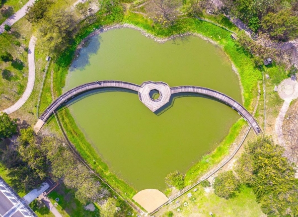 位於高速公路下方,園區占地寬廣,設有許多休閒步道、大草坪、遊樂設施等等,最吸睛的就是這座人工生態池,由上往下看竟然是由愛心形狀打造而成,彷彿外星人遺留下來的圖樣,非常神秘又浪漫呢!