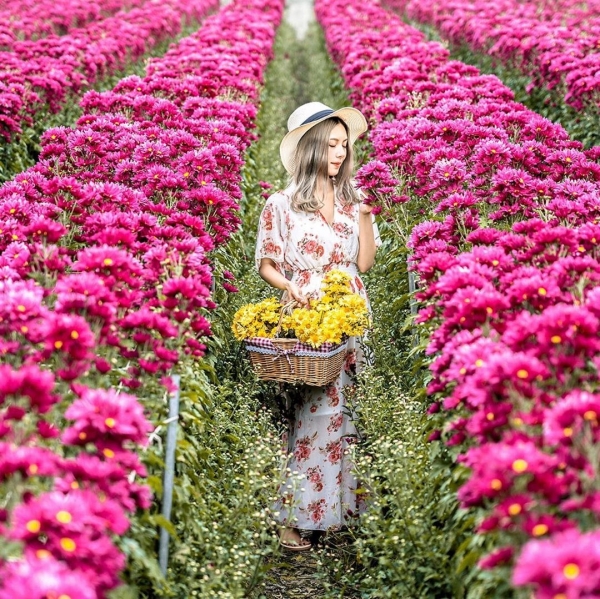 除了康乃馨之外,附近還有雙色菊花田可以看唷!只要簡單穿搭就可以拍出國外時尚照啦!