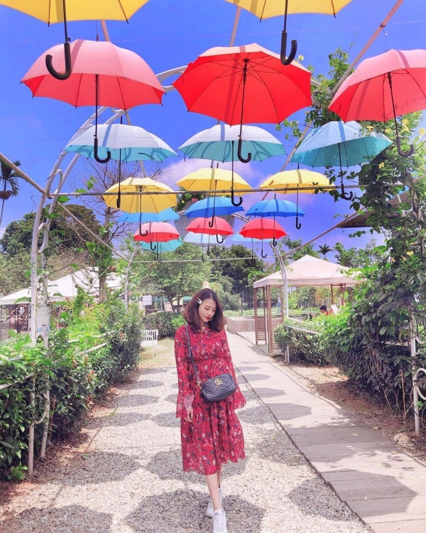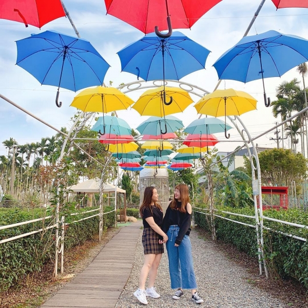 不只珍奶,園區內還有許多裝置藝術,彩虹雨傘街,在炎熱的天氣幫你遮陽,透過陽光滲出七彩光芒,好夢幻啊!!!
