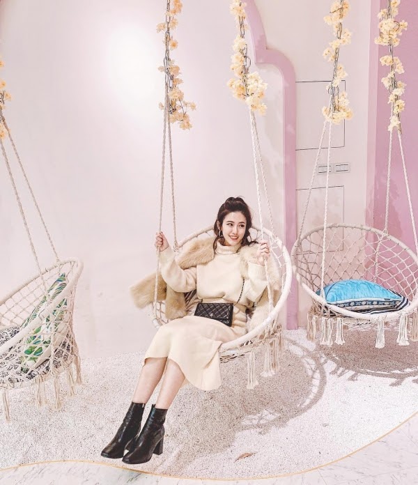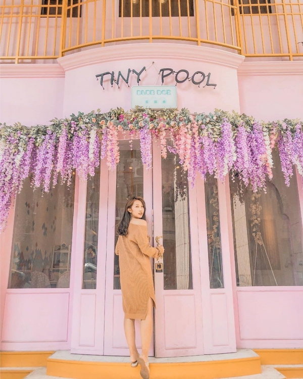 一樓用粉紫色,浪漫夢幻風的裝潢,沙灘上的鞦韆躺椅及可愛的牆面造景,還有像宮殿般的粉紫色紫藤花大門,在一樓就可以先拍個上百張!
