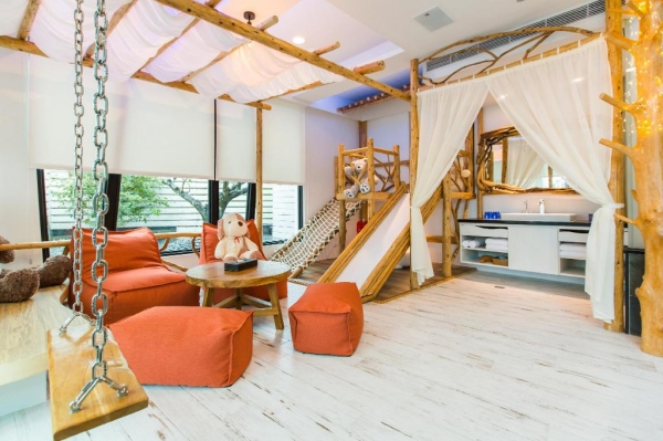 這間套房也太可愛了吧!!超適合家庭旅遊入住,還有盪鞦韆、溜滑踢可以玩,峇里島風情的配色,就是完美!!