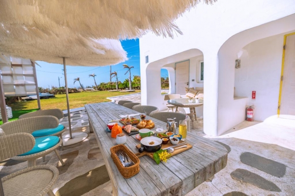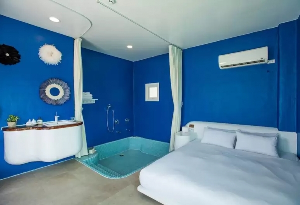 四座地中海風格建築比臨而居,十二個獨一無二的極簡空間以色彩突顯性格,為村上春樹筆下的人物賦予想像,幻化成愜意、閒趣的度假氛圍。