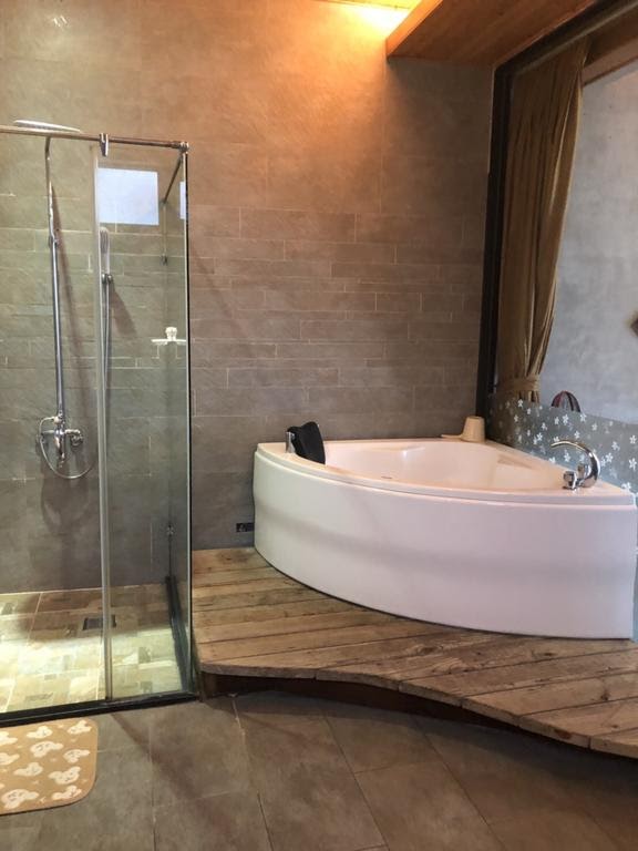 浴室採簡約風格設計,簡單又乾淨,還附有一個浴缸可以讓人泡澡,透明的玻璃窗望過去即是絕美海景,超級幸福啦!