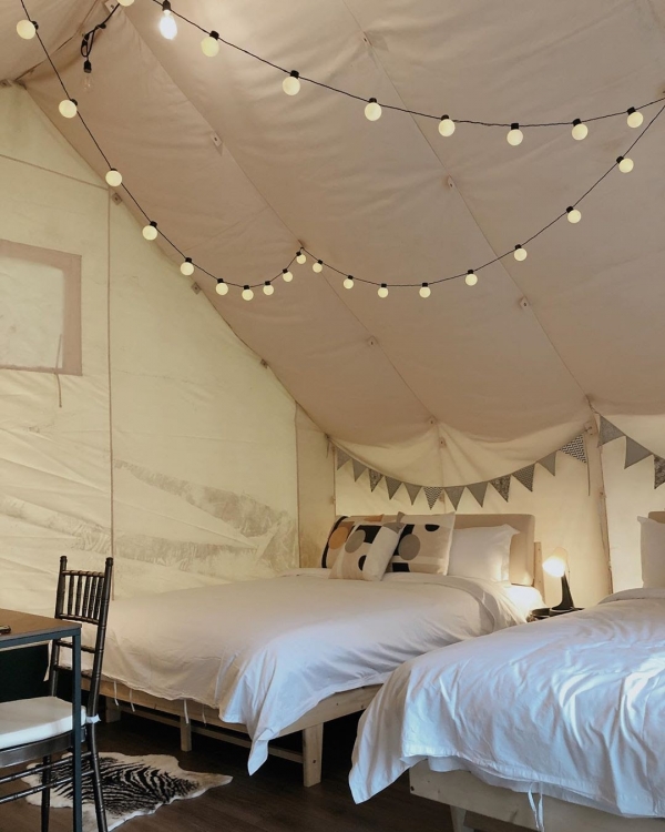 隱居於原始山林的露營區,帳棚內有加大雙人床墊,看起來就超級舒適柔軟的啦~還有獨立衛浴,不用和其他陌生人搶浴室洗戰鬥澡,絕對是懶人露營最必備的條件!
