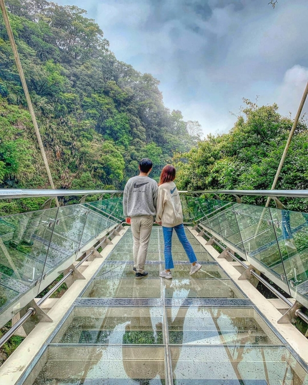 懸掛於小烏來瀑布上方,曾被民眾票選為全台最浪漫景點~天空步道底部為全透明的強化玻璃,伸出11公尺的廊道,只要站上玻璃平台上,就能居高臨下欣賞小烏來溪谷、感受氣勢磅礡的瀑布景觀,挑戰360度的全新視野!