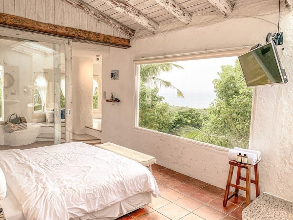 小編接下來就要介紹房間啦!看看這間超級無敵海景房,大片落地窗將最美海景盡收眼底,且整個房間漆著純白色與原木設計,就像來到南法小鄉村!