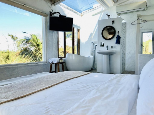 還有這個前衛又好拍的衛浴設計,白天不僅盡情享受陽光,夜晚還能仰望星空,且整個浴室設計成很可愛的圓弧型,是到這邊必打卡景點呢!怎麼拍怎麼美,會不會連洗澡也變成一種要精心打扮的事呢哈哈哈!