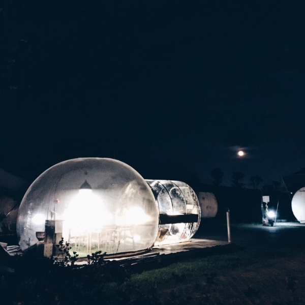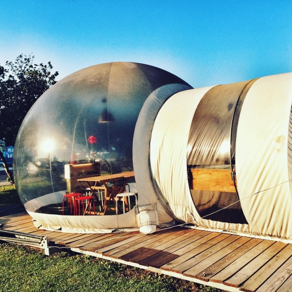 這邊也有特殊的泡泡帳篷!分成住宿用及用餐用,住宿用的帳篷篷頂有透明布幕,晚上能觀星,而餐廳帳篷更是特別,是完全透明的泡泡帳篷,從外面往裡面拍真是特別有氣氛呢!