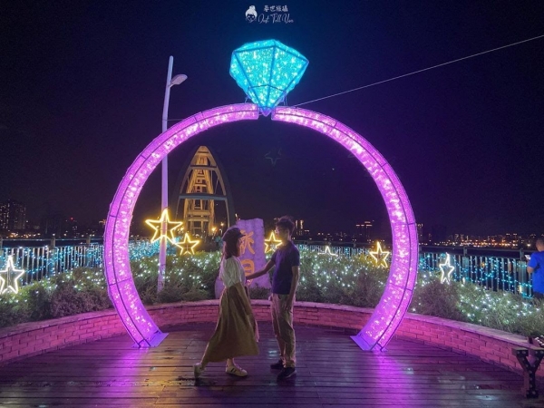 跨越板橋、新莊兩地,也是特色的彩虹光雕橋,橋上還設置透明天空步道,讓人可以站在上面觀賞水影舞動的樂趣!而最近市政府舉辦了為期一個月的「新月橋幸福光雕展」,將逼真的月球、巨大婚戒搬到橋上讓人可以打卡拍照,這邊絕對是今年最浪漫的約會景點!
