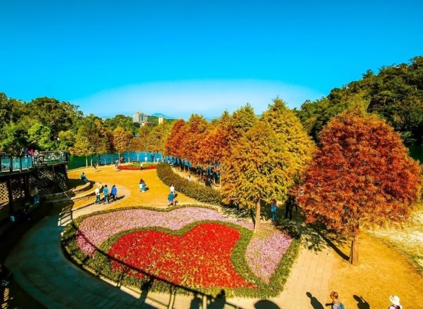 向山遊客中心根本就是來到日月潭必到的景點啊!不過最近落羽松的季節,美麗的雙心花圃與紅棕色的落羽松,來到這裡根本就是個小秘境啊!