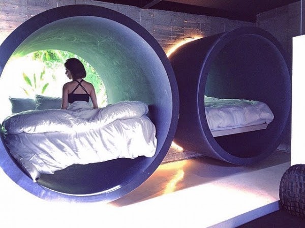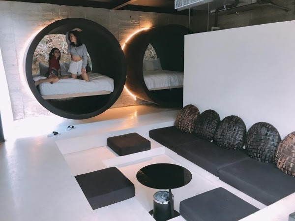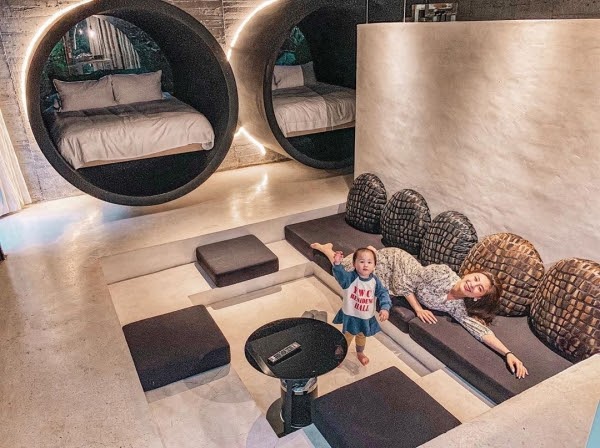 最特別的就是豪華家庭房中的雙人床是設在水管洞穴內的,超夢幻的~客廳也非常寬敞,整間設計是以石頭灰色調,乾淨舒適~