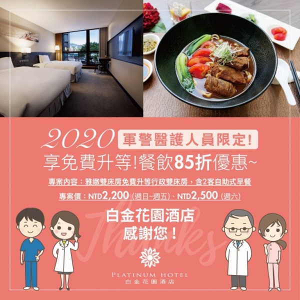 除了以上景點之外,小編再加碼告訴你們一個住宿優惠!位於新店區的「白金花園酒店」為了體恤辛苦的軍警醫護人員,推出的「2020軍警醫護人員住房、餐飲85折限時優惠」原為4/13-5/31,現在延長至6/30囉!