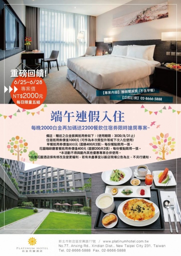 除此之外,端午連假入住,每晚2000白金再加碼送2200餐飲住宿劵限時搶房專案,每日限量五組!